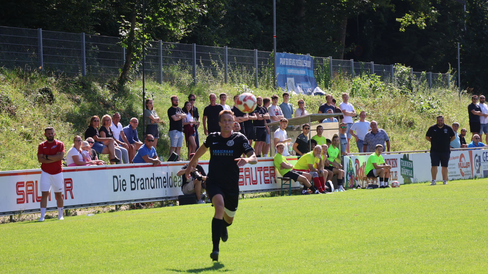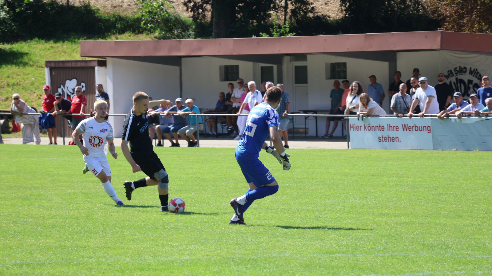 Saisonauftakt des SVB mit dem Lokalderby gegen den FC Heidelsheim mit Neuzugang Torwart Kaan Balkis (grünes Trikot) hinter Kapitän Maurice Krüger.