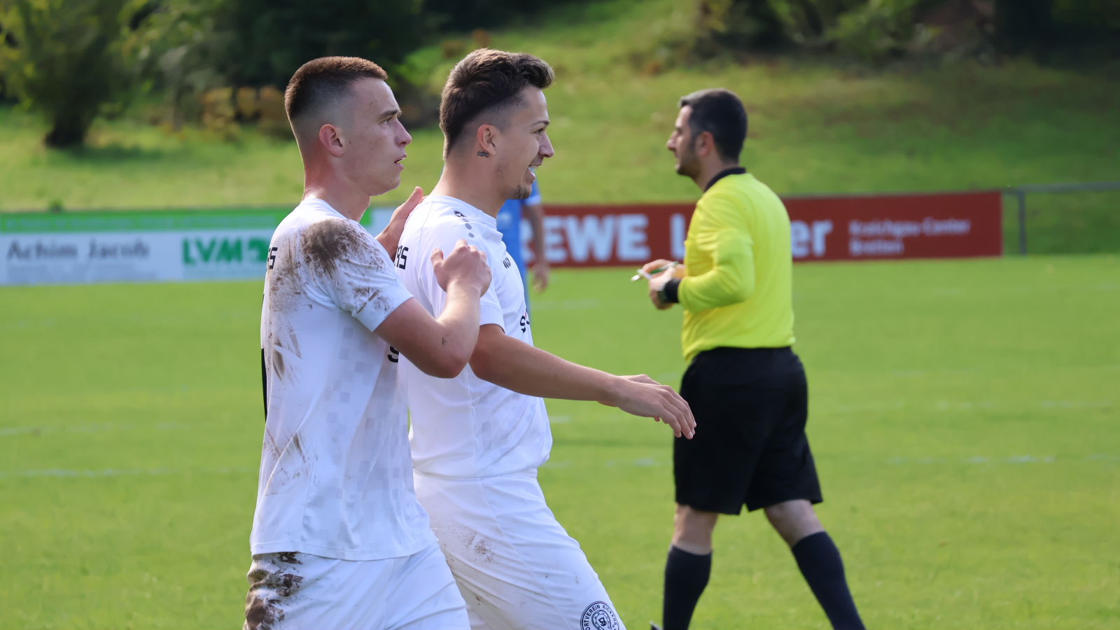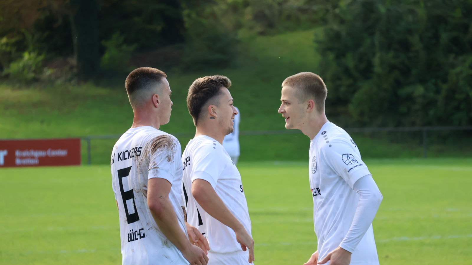 SVB-Torschütze Leon Steinbrenner (re.) freut sich mit Teamkollegen Eray Toprakkazar (Mitte) und Felix Gerweck (li.) über den Ausgleichstreffer.