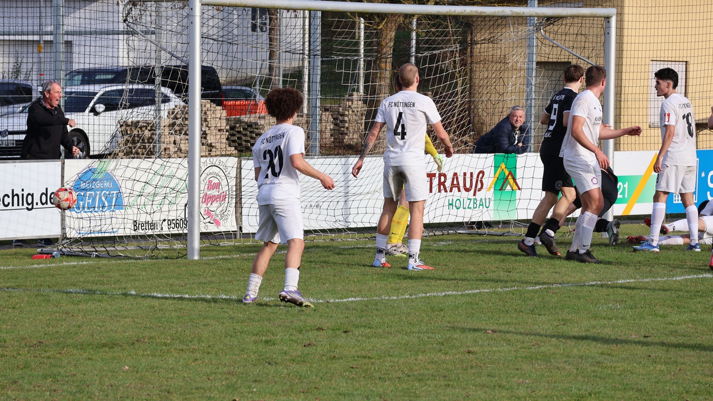 In Nöttingen mussten die Kickers auf die verletzten Colin Hiller und Bedi Meral verzichten. Zudem fiel Spielertrainer Benjamin Dauenhauer ebenso wegen einer Sperre aus wie Abwehrrecke Felix Gerweck. Marlon Röderer musste nach dem Warmmachen passen, und zu allem Überfluss zog sich Kapitän Maurice Krüger bereits nach wenigen Minuten eine Verletzung an der Leiste zu. Bei Krügers Auswechselung stand es bereits 1:0 für die Hausherren, die einen furiosen Start hinlegten und die Büchiger Defensive schwer unter Druck setzten. Nach einer Umstellung im Abwehrblock kamen die Kickers besser ins Spiel und auch zu Torchancen. In dieser Phase fiel dann auch der Ausgleich. Der für Krüger eingewechselte Felix Veith schickte Simon Markovic steil, und der Kickers-Akteur traf in der 32. Minute zum 1:1. Doch die Freude im Büchiger Lager sollte nicht lange anhalten. Nach einem unnötigen Foulspiel vor dem Strafraum netzte die Heimelf per Freistoß zur erneuten Führung ein. Keine fünf Minuten später bekam die Kickers-Abwehr den Ball nicht aus der Gefahrenzone und FC-Stürmer Shala sorgte mit seinem ersten Tor für die 3:1-Halbzeitführung.