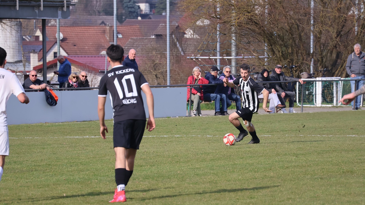 Die Gäste aus Ettlingenweier kamen mit der Visitenkarte von drei Siegen in Folge nach Büchig. Auf tiefem Geläuf entwickelte sich von Beginn an eine kampfbetonte Partie. Die erste Viertelstunde gehörte den Kickers. Bereits in der 6. Spielminute startete Mete Yüksel durch, setzte das Leder aber knapp über den Kasten. Keine zehn Minuten später gingen die Hausherren in Führung. Nach einem Eckball stand SVB-Kapitän Niklas Koch goldrichtig und traf per Kopf zum 1:0. Danach war das Spiel ausgeglichen. Auch die Gäste kamen nun zu Torchancen. Kickers-Keeper Kaan Balkis parierte zweimal glänzend. Fünf Minuten vor der Halbzeit zog der starke Yüksel, den die Gästeabwehr nie in den Griff bekam, erneut einen Sprint an. Der Ball landete bei Marlon Pippes, der eiskalt zur 2:0-Halbzeitführung vollendete.